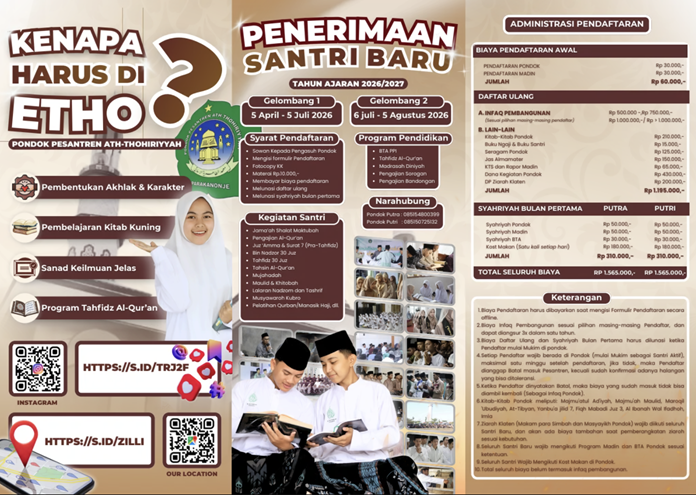 Pondok PesantrenAth-Thohiriyyah Parakanonje, Karangsalam Kidul, Kedung Banteng, Banyumas, Jawa Tengah. Download BrosurPendaftaran santri baru tahun ajaran 2026/2027 Pengurus Putra+62 851-5480-0399 Pengurus Putri+62 851-5072-5132 Instagram Facebook Youtube